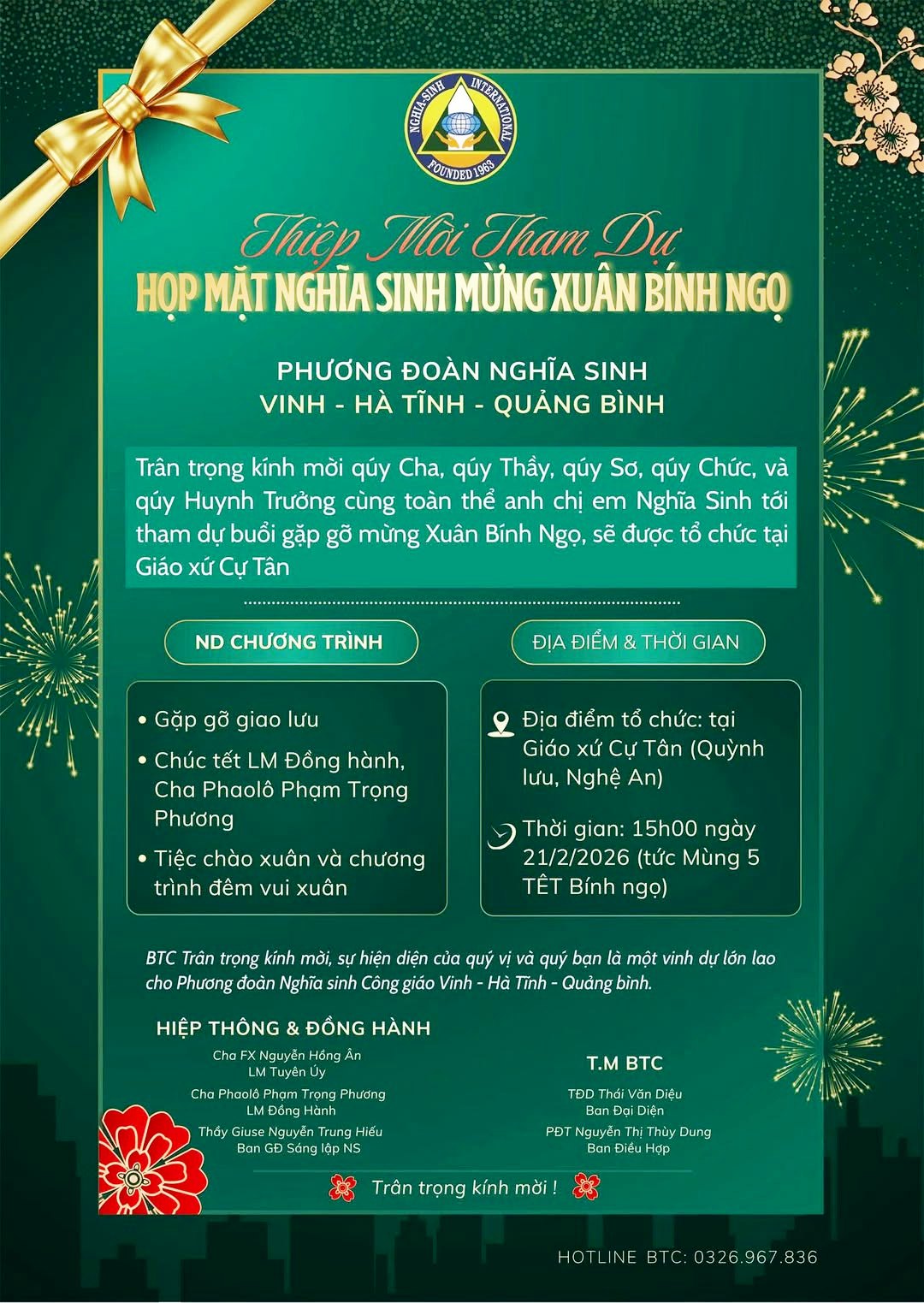 - Phương Đoàn Nghĩa Sinh Công Giáo Vinh - Hà Tĩnh & Quảng Bình họp mặt mừng Xuân Bính Thìn ngày Mùng 5 Tết tại Hội Trường Giáo Xứ Cự Tân, Giáo Phận Vinh (30/01/2026)