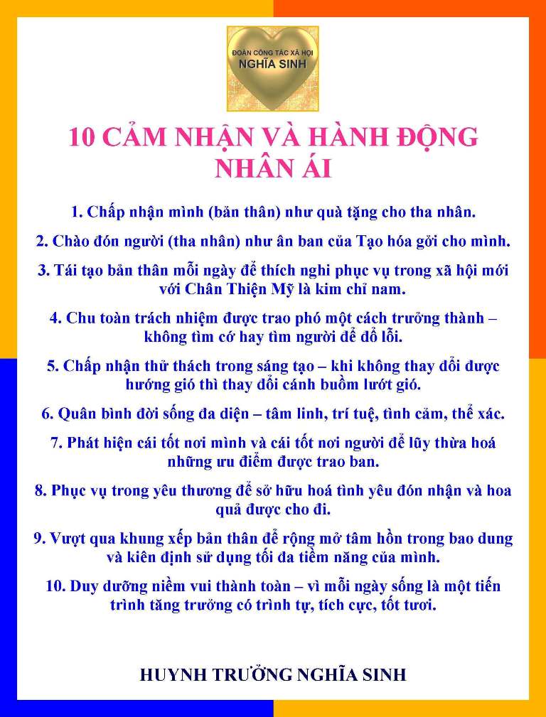 10 Việc Nhân ái (hay 10 Cảm nhận và Hành động Nhân ái) đã được Huynh trưởng Nghĩa Sinh Nguyễn Trung Hiếu soạn thảo ngày 24/11/1983 -- là ngày Lễ Tạ Ơn Nghĩa Sinh đầu tiên được tổ chức tại Hoa Kỳ.