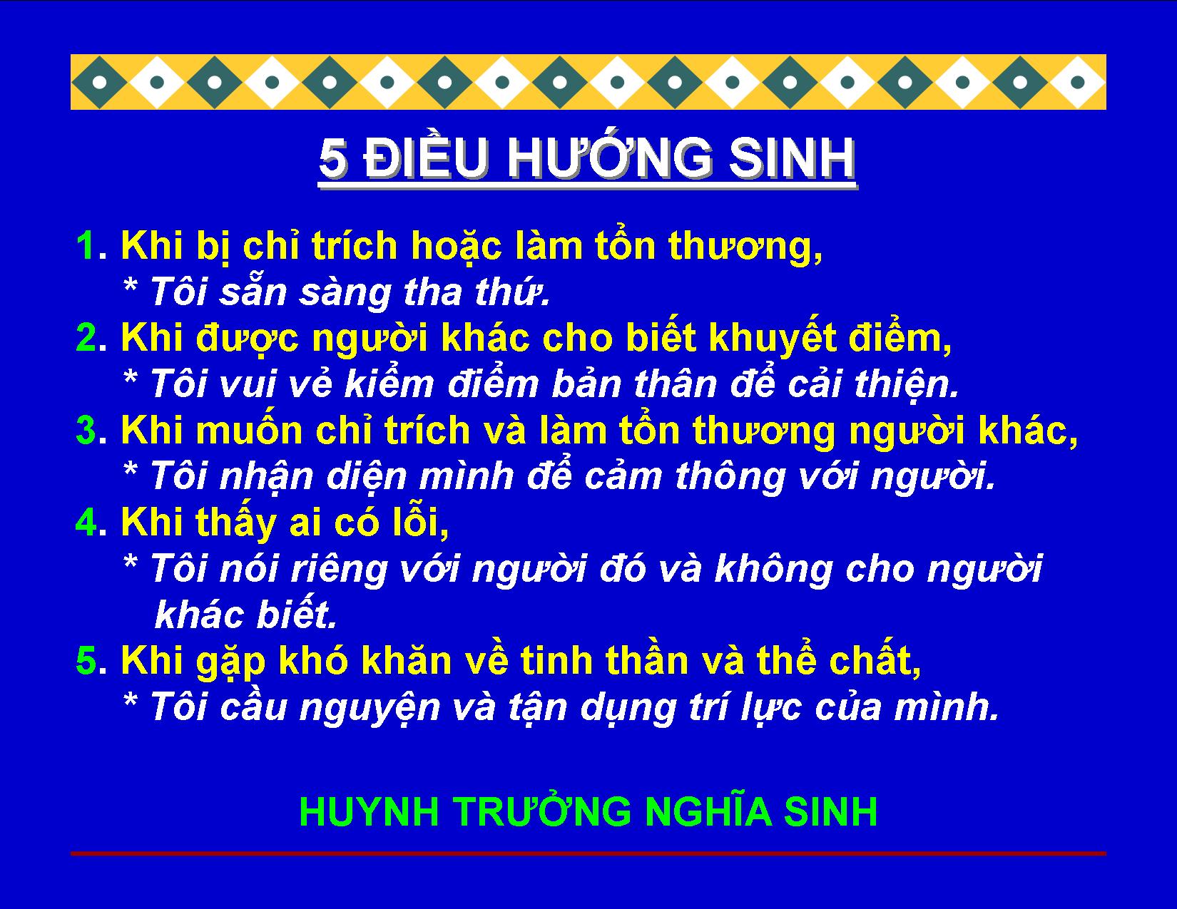 Xin Thượng Đế tiếp tục chúc lành cho tất cả anh chị em Nghĩa Sinh khắp nơi để mỗi người -- trong mỗi hoàn cảnh và môi sinh -- tiếp tục thi hành sứ vụ cải thiện mình, giúp ích người và quảng bá những giá trị (values) của nền văn minh tình yêu (the civilization of love) đến mọi người với ước nguyện hòa bình, thịnh vượng, tiến bộ, hạnh phúc sẽ "lên ngôi" và tỏa sáng trong tất cả các cộng đoàn và cộng đồng nhân loại.
