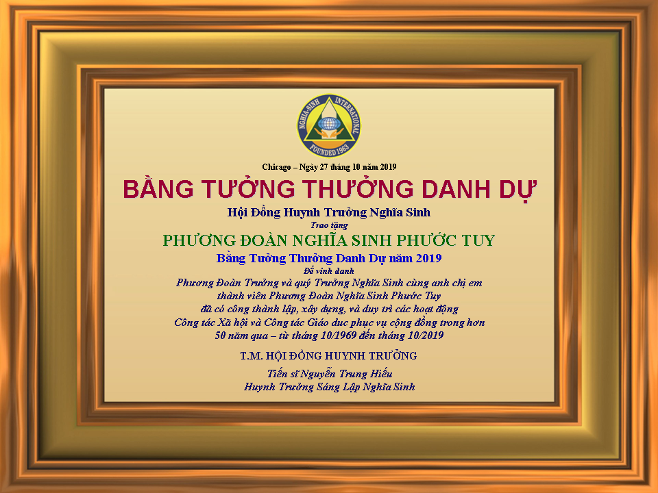 - Bằng Tưởng Thưởng Danh Dự Nghĩa Sinh Phước Tuy * 1969-2019 (27/10/2019)