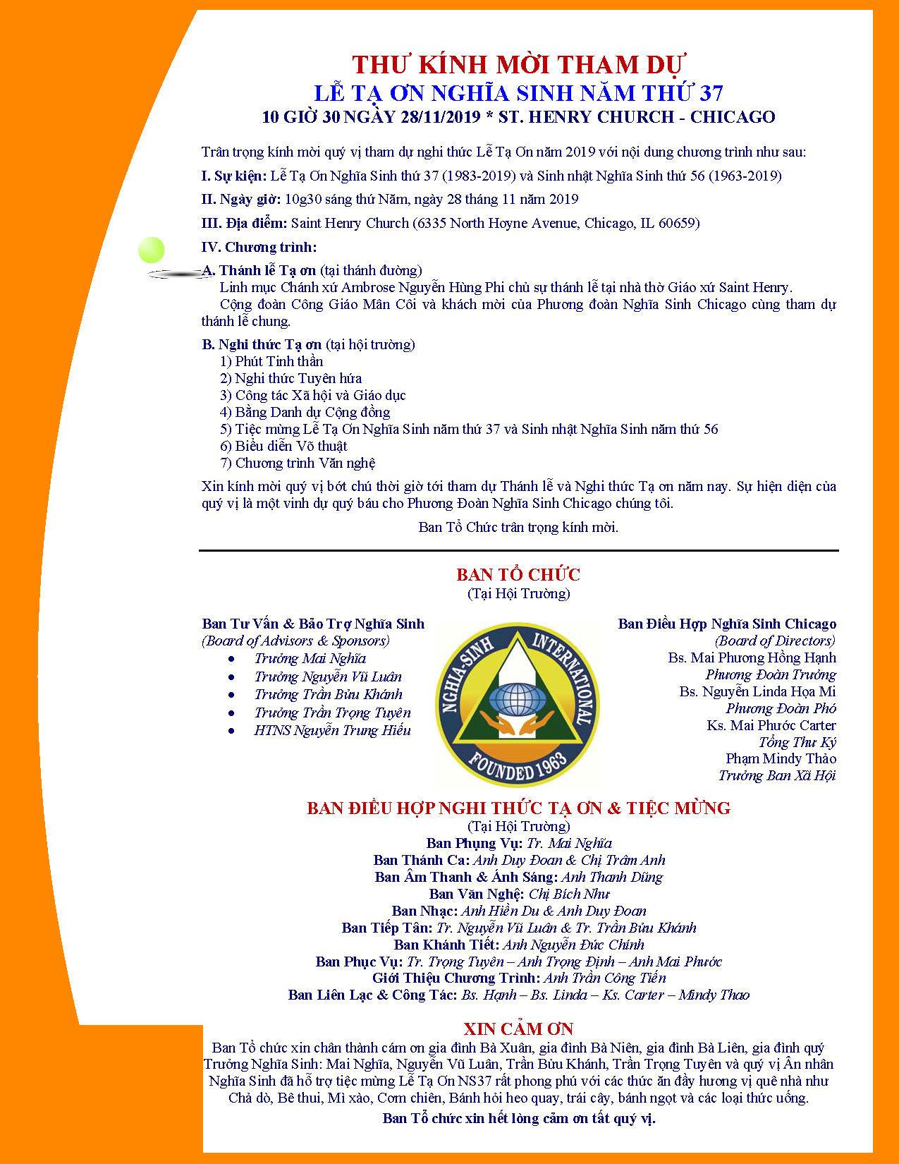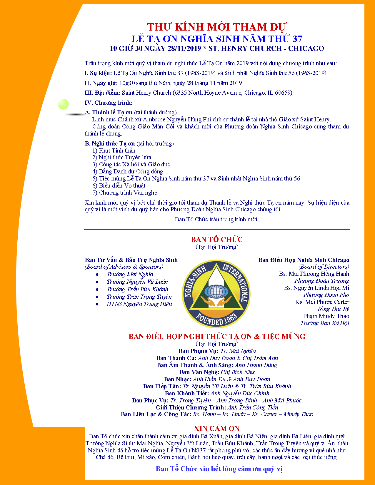- Thư mời Lễ Tạ Ơn Nghĩa Sinh năm thứ 37 * Thanksgiving 2019 (16/11/2019)