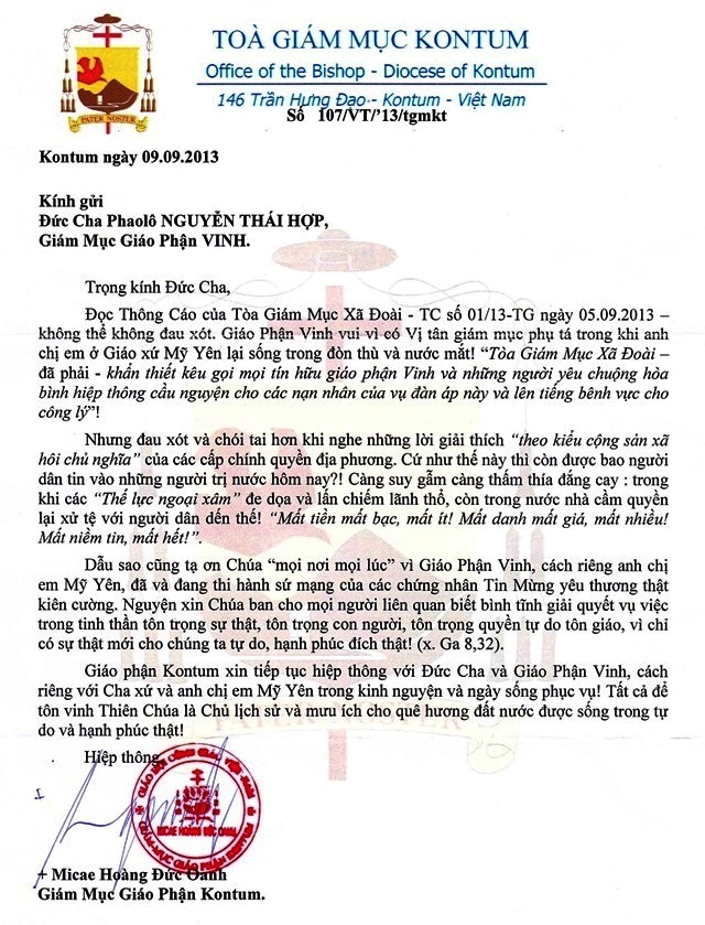 - Thư hiệp thông của ĐGM Hoàng Đức Oanh (19/09/2013)