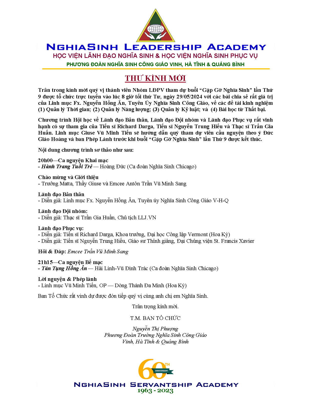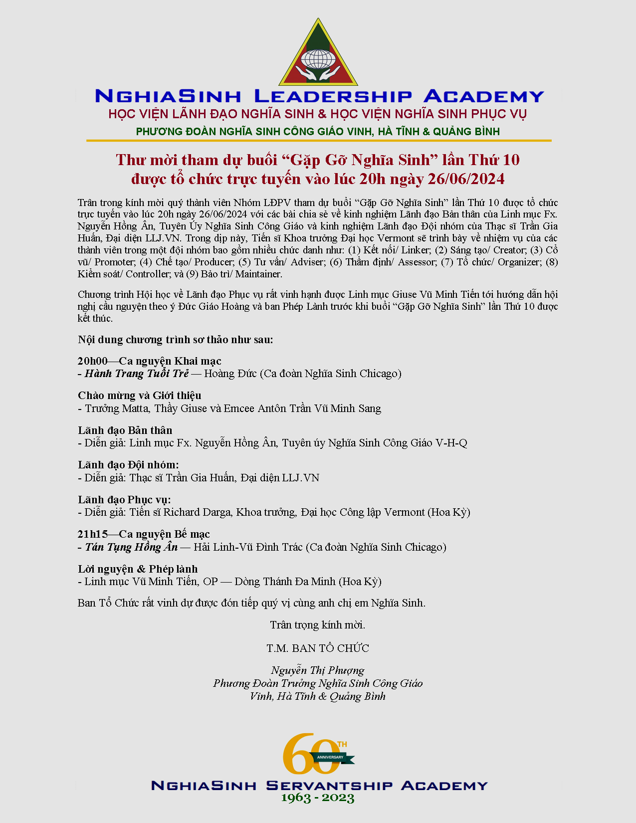 - Thư mời tham dự buổi "Gặp Gỡ Nghĩa Sinh" lần Thứ 10 * Huynh Trưởng Nghĩa Sinh (19/06/2024)