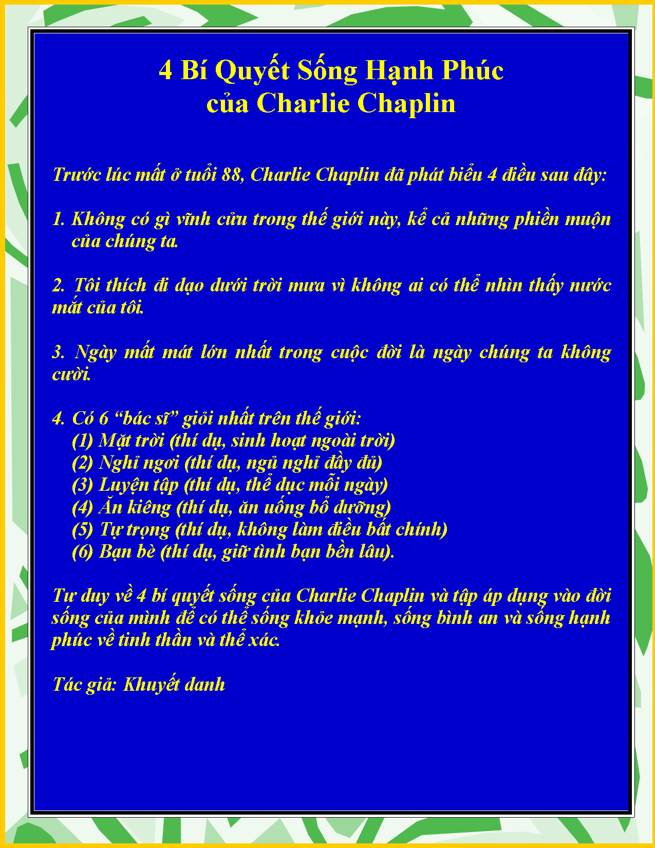 - 4 Bí Quyết Sống Hạnh Phúc của Charlie Chaplin * Sưu tầm (01/01/2021)