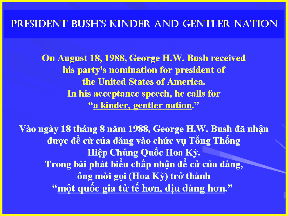 - TT George H.W. Bush ước mong Hoa Kỳ là một quốc gia tử tế hơn, dịu dàng hơn (28/09/2020)